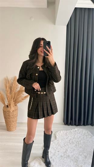 Ernesto Tüvit Düğmeli Kahve Ceket Ernesto Gold Zincir Kemerli Tüvit Kahve Etek
