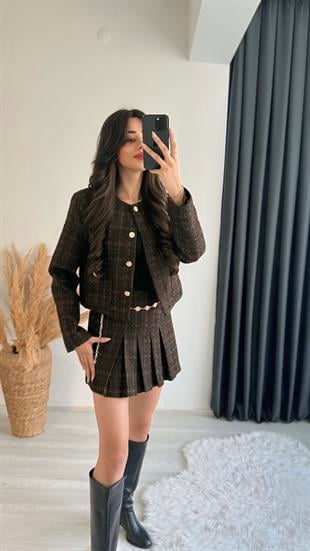 Ernesto Gold Zincir Kemerli Tüvit Kahve Etek Ernesto Tüvit Düğmeli Kahve Ceket