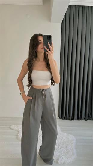 Minella Gri İp Detaylı Pileli Poliviskon Pantolon (SDU2225S)