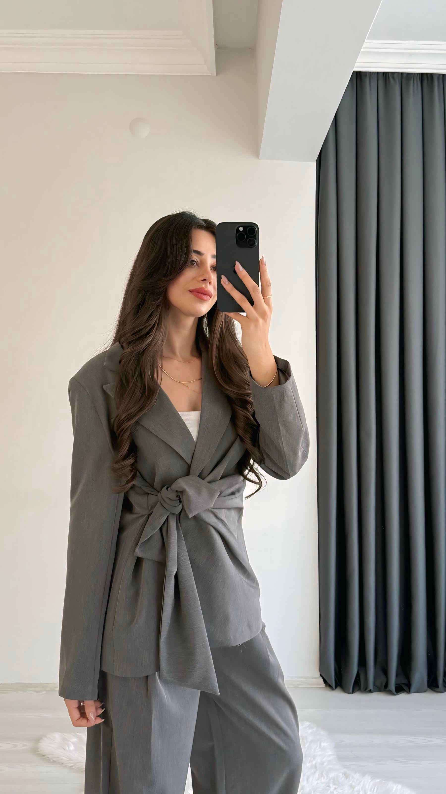 Minella Önü Bağlamalı Vatkalı Blazer Ceket Minella Gri İp Detaylı Pileli Poliviskon Pantolon