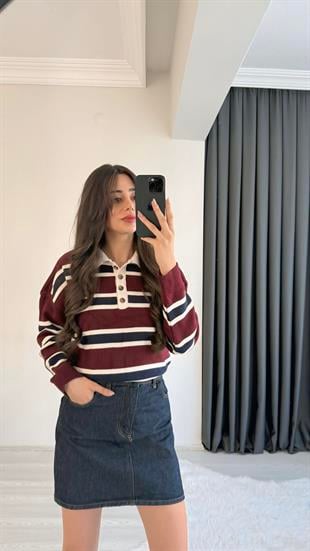 Mua Bordo Krem Çizgili Polo Yaka Kazak (SDU2209Std)
